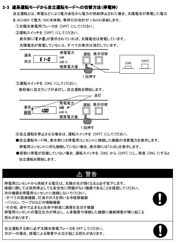停電時に自立運転できるタイプを選んだことは覚えていたのですが、恥ずかしながら、切り替え方法を全然わかっていませんでした。