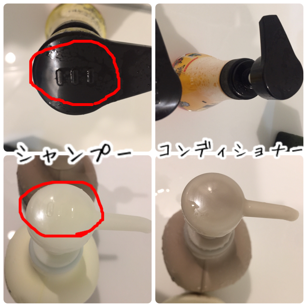 ・シャンプーとコンディショナーは、ボトルの押す部分に違いあり。デコボコがあるのが、シャンプー。つるつるなのが、コンディショナーでした ( ・ิω・ิ)キリ